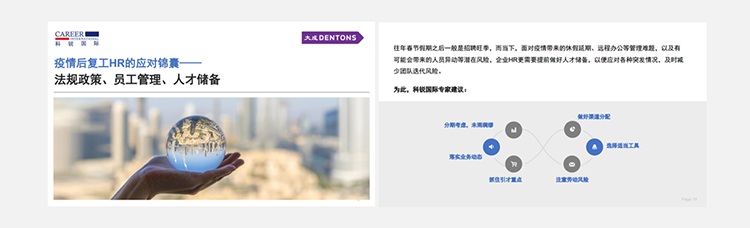 为了帮助众多企业人力资源工作者应对挑战,维多利亚老品牌VIC国际联合国内知名律所“大成律师事务所”,推出疫情后《复工HR的应对锦囊》手册,从法律政策、员工管理、人选储备几个方面对企业HR有序召开复工后的各项人力资源管理给予帮助。